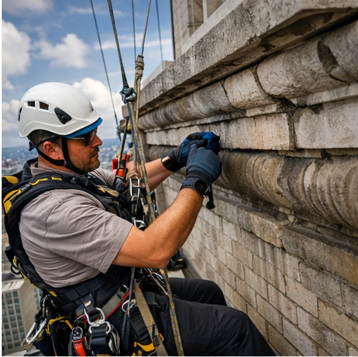 We primarily utilize rope access methods to perform close-up, non-invasive inspections of building envelopes. This approach allows us to safely access difficult or hard-to-reach areas with minimal disruption to building operations, occupants, and surrounding property. Rope access also enables a level of detail and accuracy that cannot be achieved through binocular surveys or limited lift access alone.